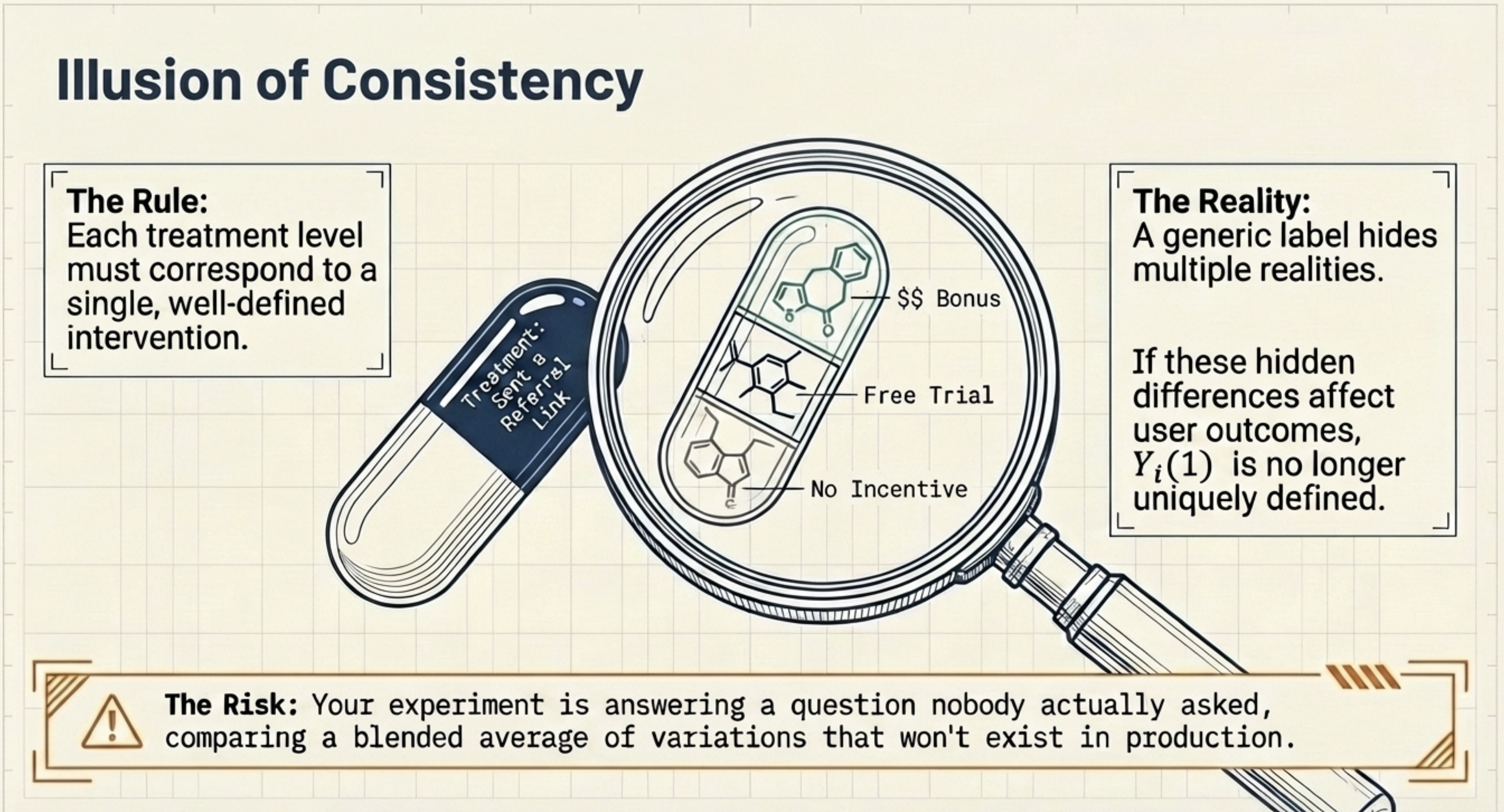 Two users assigned to treatment may therefore receive different interventions. If these differences affect outcomes, the potential outcome \(Y(1)\) is no longer uniquely defined. The treatment label hides multiple versions of the intervention.