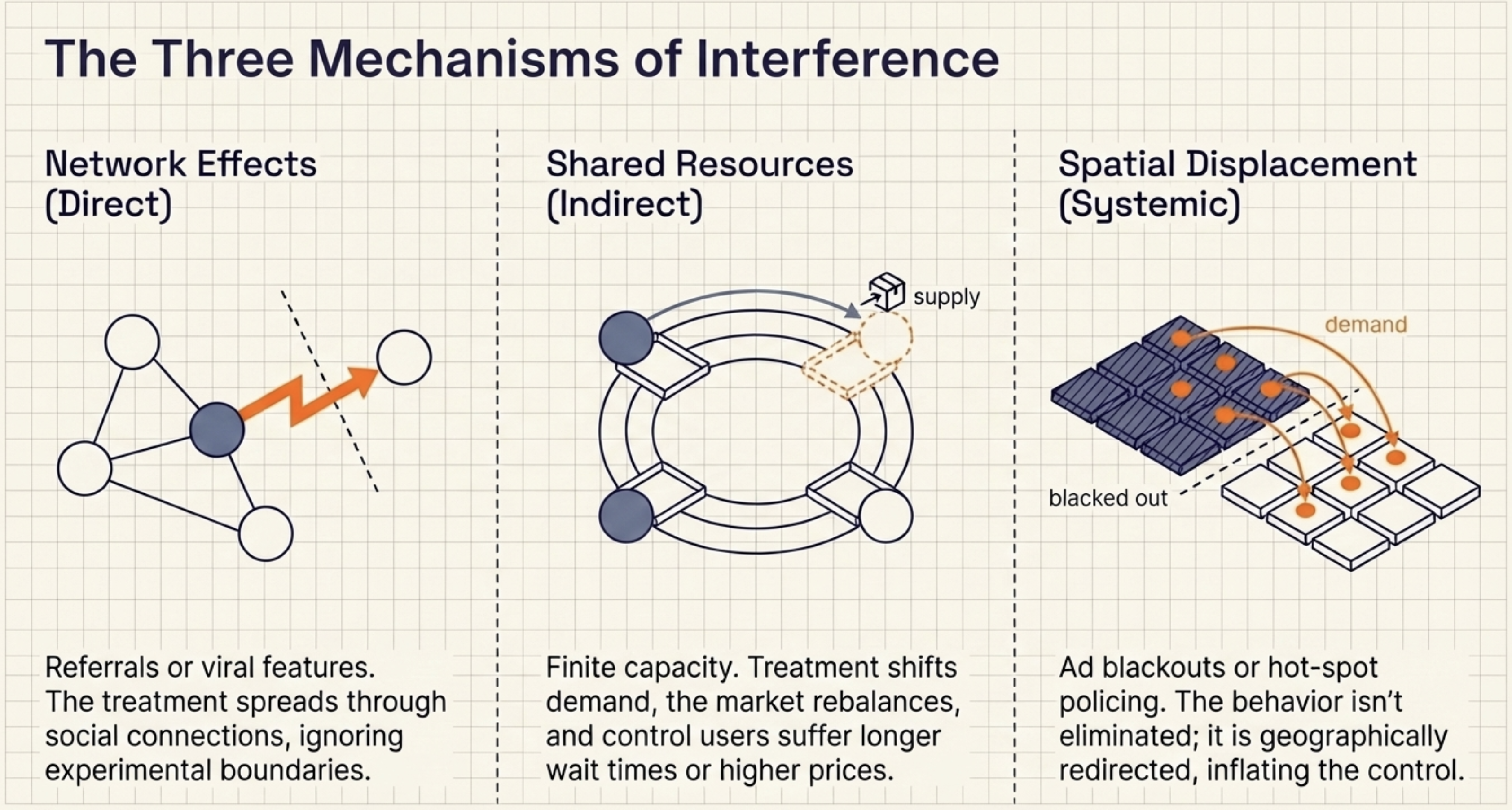 Now imagine a different promotion: a chain offers in-store discounts at randomly selected locations. Customers near non-discounted stores don’t stop shopping — some simply drive to a discounted store nearby. Demand spills over geographically, inflating outcomes at discounted locations and deflating them at control locations (Verbitsky-Savitz and Raudenbush 2012).