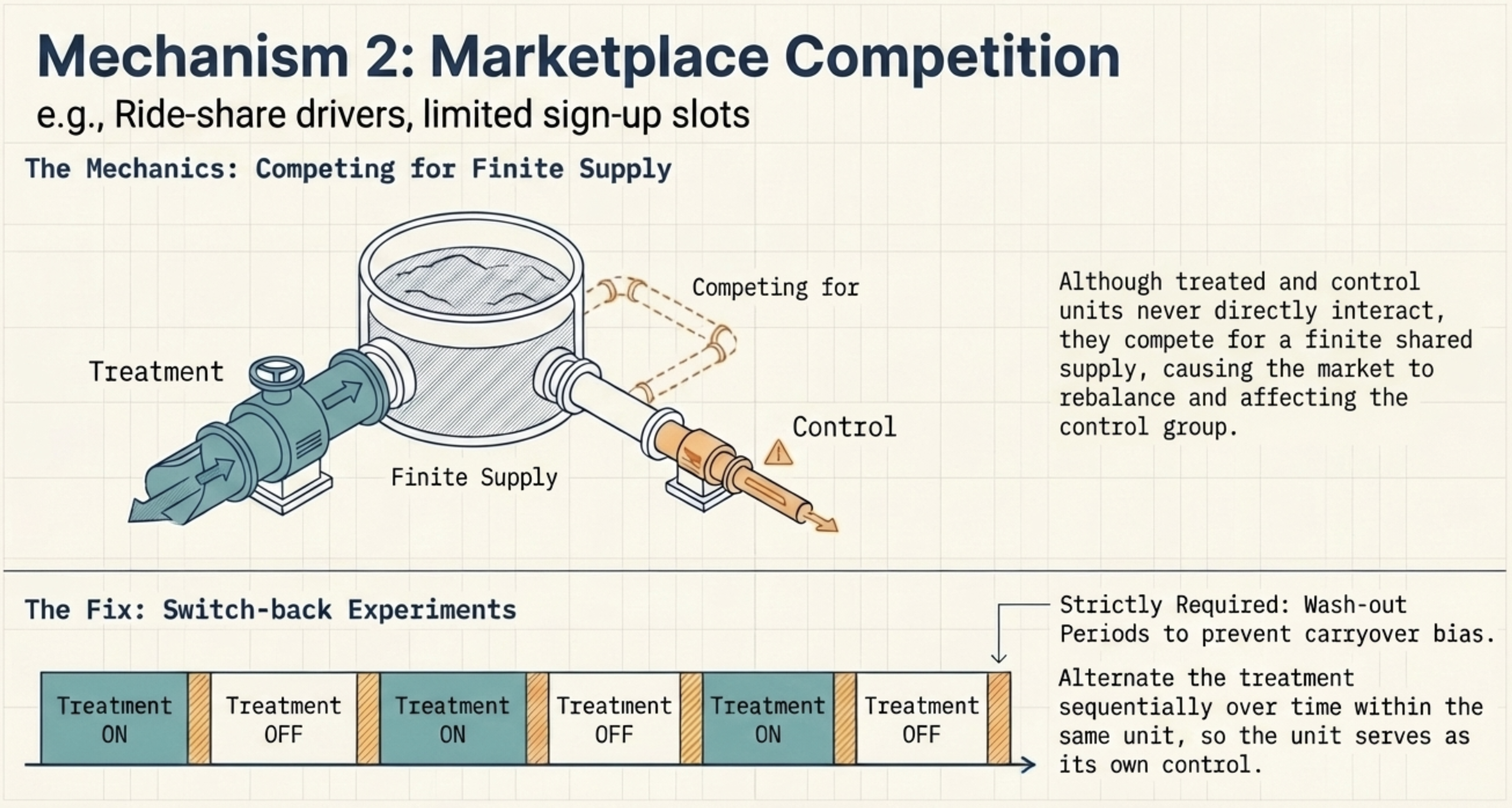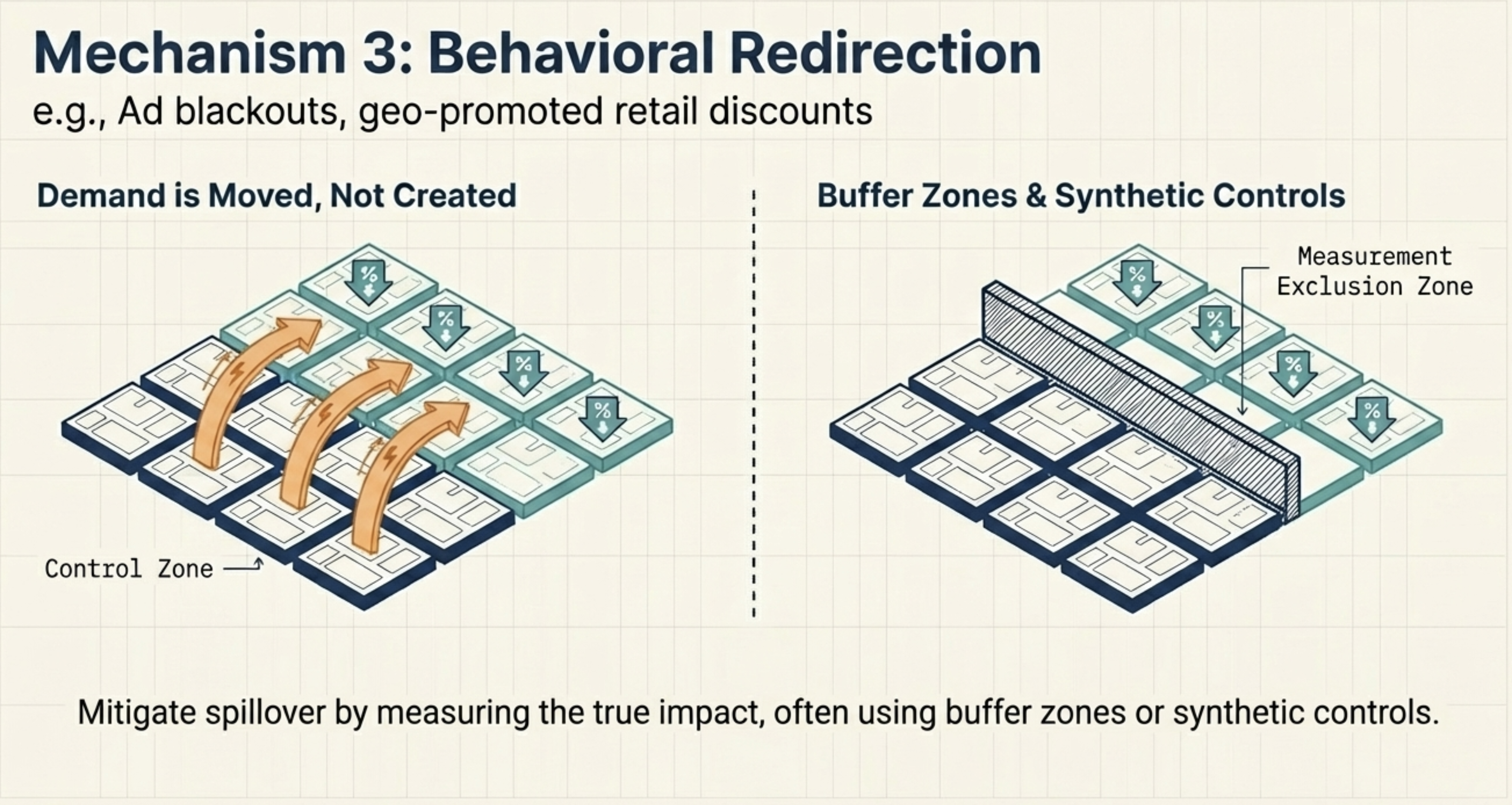 When the intervention doesn’t eliminate a behaviour but moves it somewhere else, the fix depends on the type. For systemic shifts, a traditional A/B test fails by construction — the intervention changes the baseline for everyone. Instead, launch to an entire market and measure against a synthetic control: a weighted combination of similar unaffected markets that serves as the counterfactual. For spatial displacement, randomize at the level of naturally separated markets — e.g., different cities or countries — so geographic spillover between treatment and control is negligible. Where that’s not possible, exclude border areas from measurement to create a buffer between groups.