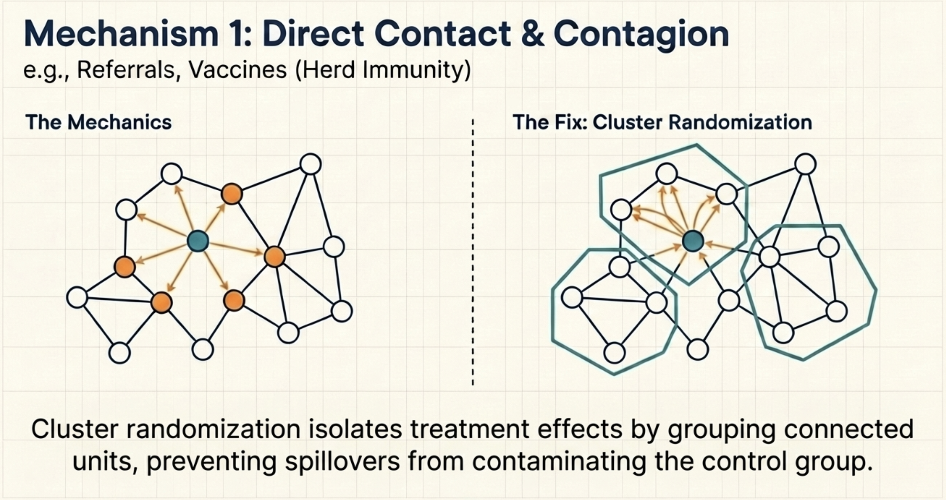 User A receives a referral link, shares it with friend B, and B’s behaviour changes — even if B was in the control group. The treatment spreads through social connections, not through the experimental design. The same happens in public health: vaccinating part of a population protects unvaccinated neighbours through herd immunity (Aronow and Samii 2017; Halloran and Struchiner 1995).