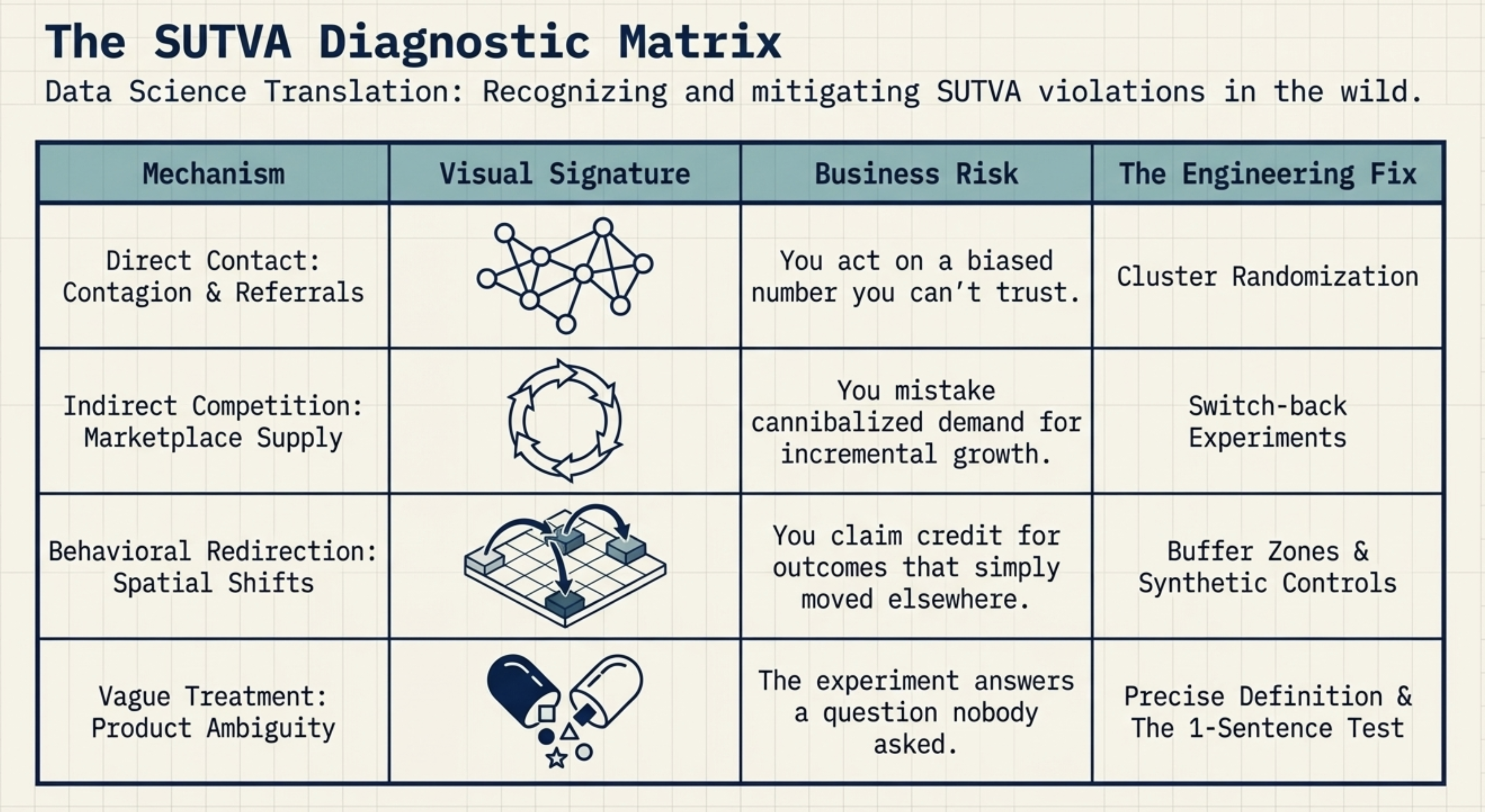 Here is a quick-reference summary of SUTVA violations — what breaks, what it costs, and how to fix it.